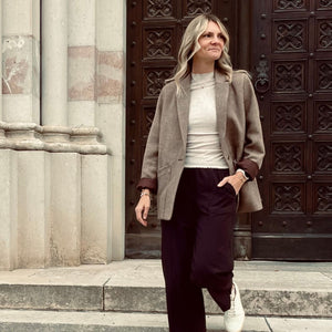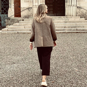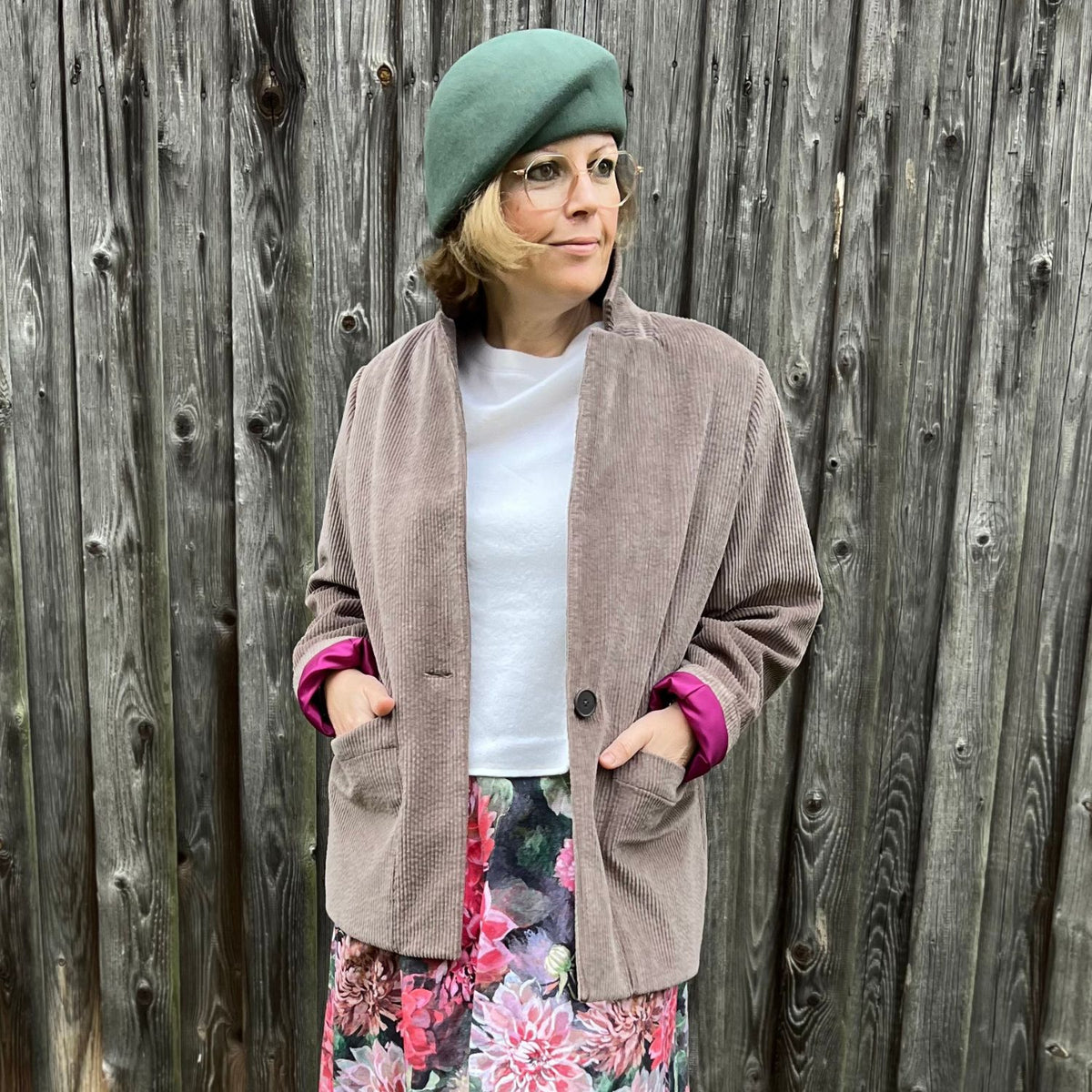 Handmade im wahrsten Sinne des Wortes, denn bei der hochwertigen Verarbeitung von Cléo werden die Nahtzugaben innen von Hand umgenäht. Das ist zwar zeitaufwendiger als die Variante mit der Overlock, aber immer noch viel schneller als gestrickt 😉 Strickjacke Cléo hat außerdem auch noch schöne Faltendetails am Halsausschnitt und an den Ärmeln. So ist die Jacke selbst aus einem schlichten Stoff besonders.