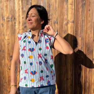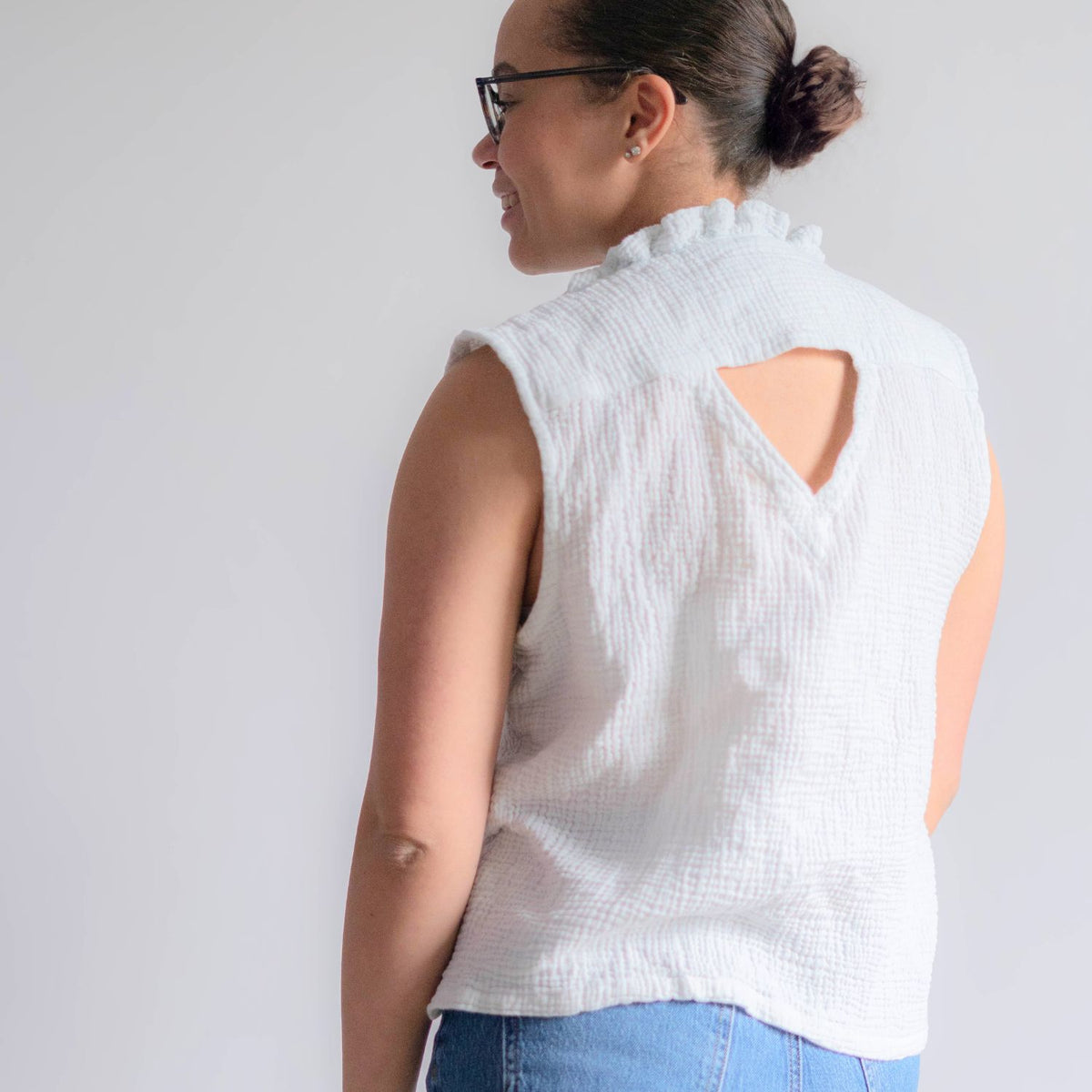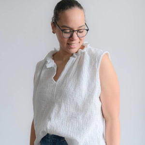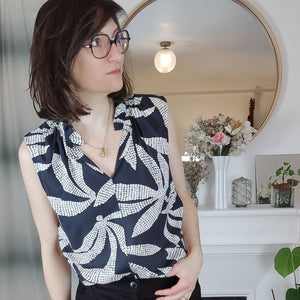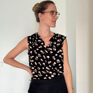 Ich habe mir diesen Schnitt schon zwei mal genäht. Aus sehr fließendem Modaljersey mit langen Ärmeln. Und, besonders edel, weiß, ärmellos, Vorderteil aus feinstem Hanfwebstoff (Leinen geht sicher auch) kombiniert mit Rückenteil aus Jersey. Sieht sehr edel aus. Mag es. denke, ich muss mir mal wieder eines nähen. Auf den Fotos die ungebügelte Version in lässig. ;-)