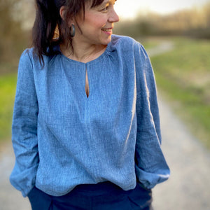 Handmade im wahrsten Sinne des Wortes, denn bei der hochwertigen Verarbeitung von Cléo werden die Nahtzugaben innen von Hand umgenäht. Das ist zwar zeitaufwendiger als die Variante mit der Overlock, aber immer noch viel schneller als gestrickt 😉 Strickjacke Cléo hat außerdem auch noch schöne Faltendetails am Halsausschnitt und an den Ärmeln. So ist die Jacke selbst aus einem schlichten Stoff besonders.