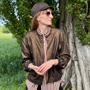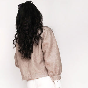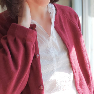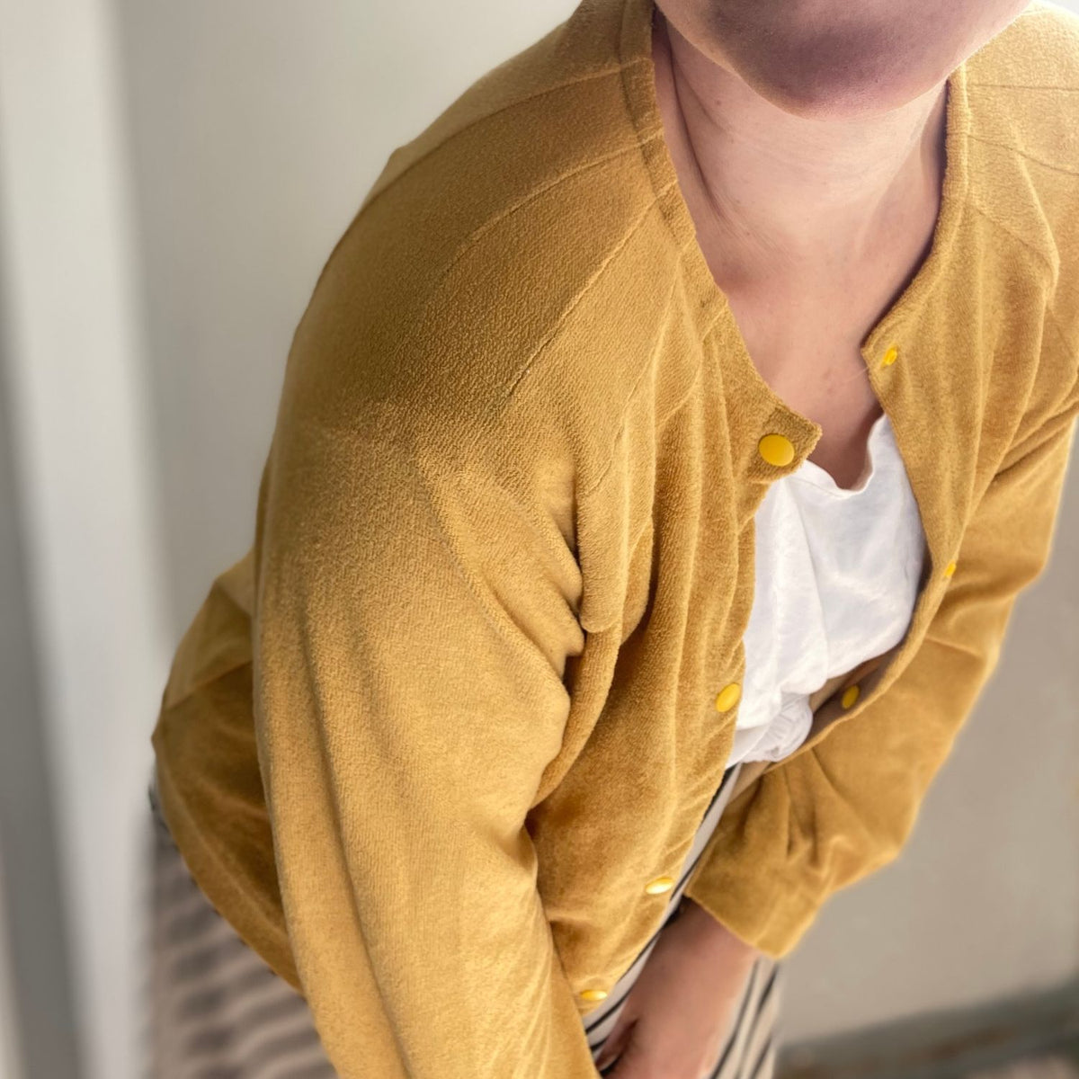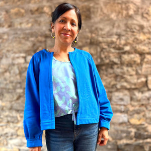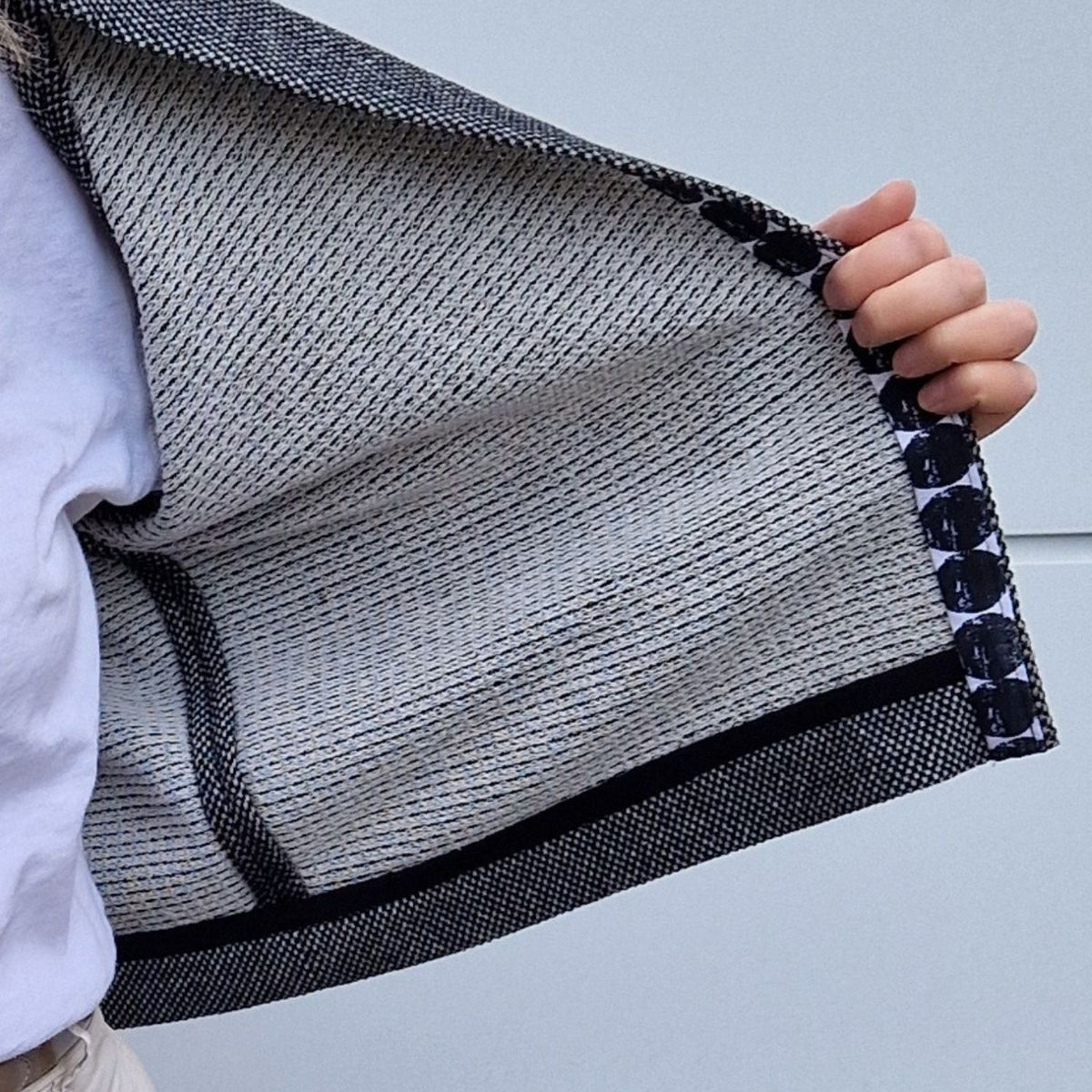 Handmade im wahrsten Sinne des Wortes, denn bei der hochwertigen Verarbeitung von Cléo werden die Nahtzugaben innen von Hand umgenäht. Das ist zwar zeitaufwendiger als die Variante mit der Overlock, aber immer noch viel schneller als gestrickt 😉 Strickjacke Cléo hat außerdem auch noch schöne Faltendetails am Halsausschnitt und an den Ärmeln. So ist die Jacke selbst aus einem schlichten Stoff besonders.