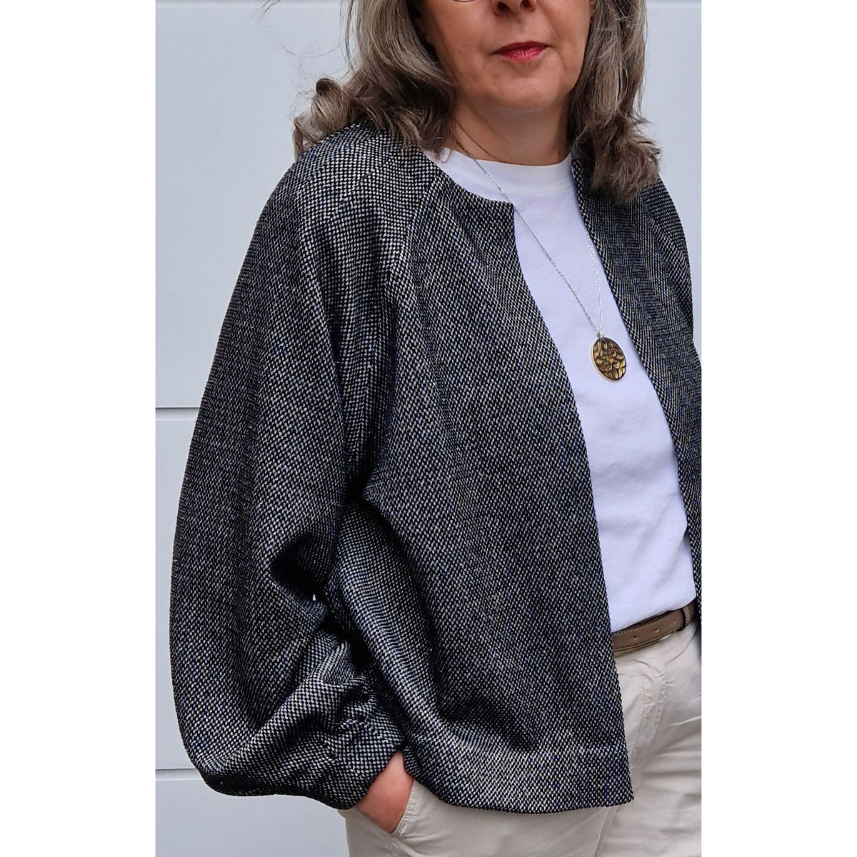 Hier zeige ich Euch meine Cléo aus Punta di Roma. Ich mag die glatte Haptik an diesem Stoff, wirkt sehr edel und businesstauglich. Vor allem kommen die schönen Faltendetails am Halsausschnitt und an den Ärmeln sehr zur Geltung. So ist die Jacke selbst aus einem schlichten Stoff besonders.