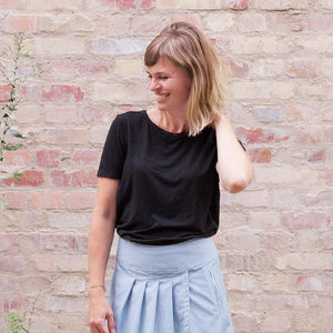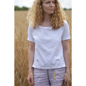 Ich habe mir diesen Schnitt schon zwei mal genäht. Aus sehr fließendem Modaljersey mit langen Ärmeln. Und, besonders edel, weiß, ärmellos, Vorderteil aus feinstem Hanfwebstoff (Leinen geht sicher auch) kombiniert mit Rückenteil aus Jersey. Sieht sehr edel aus. Mag es. denke, ich muss mir mal wieder eines nähen. Auf den Fotos die ungebügelte Version in lässig. ;-)